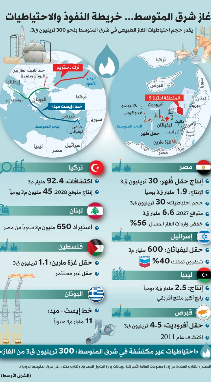 资源储量与未来风险据“东地中海天然气论坛”数据,该区域天然气储量估计高达122至300万亿立方英尺,价值巨大。然而,巨大的经济利益与悬而未决的主权主张相互交织,使得和平解决前景复杂。专家指出,尽管国际仲裁是理想途径,但各方缺乏信任。埃及军事专家萨米尔·法尔吉少将预警:“未来区域武装冲突将围绕地中海天然气展开。”