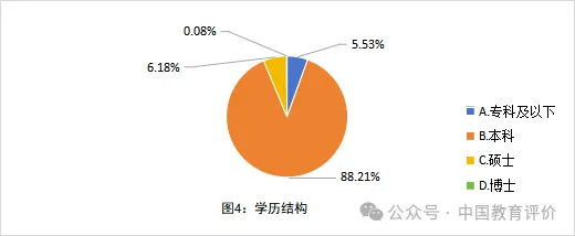 从学历来看,拥有本科及以上学历的教师占比高达94.47%,专科及以下学历仅4501人(5.53%),硕士及以上学历5095人(6.26%)(见图4)。