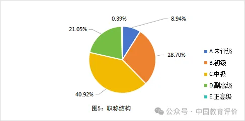 从职称来看,副高级及以上教师占比21.44%,中级职称教师占比40.92%,初级及未评级教师合计占比37.64%,与我国中小学教师岗位设置比例相近(见图5)。