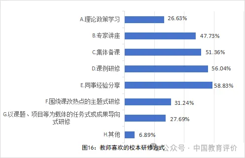 教师喜欢的校本研修方式呈现鲜明特征:首先,实践共同体占据绝对主导地位,教师选择最喜欢的校本研修活动前三项均聚焦同伴协作,依次为同事经验分享(58.83%)、课例研修(56.04%)、集体备课(51.36%),说明教师更加希望校本研修能够帮助他们解决教育教学中的实际问题;与之相对的是,理论政策学习的喜好程度占比仅为26.63%。其次,“专家讲座”占比为47.73%,高于理论政策学习,但显著低于前三项实践类活动,反映出教师虽认可专家的权威性,却更倾向于“专家引导+同伴实践”的混合研修。此外,教师对“课改热点研修”(31.24%)和课题项目式研修(27.69%)的兴趣偏低,折射出广大教师自觉学习课程改革新的理念、方法等方面有待提升(见图16)。