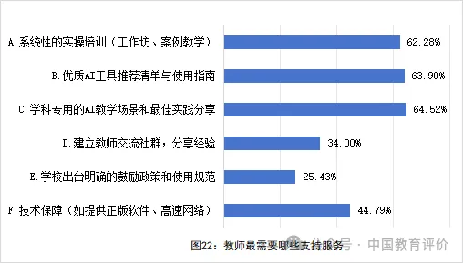 教师在使用AI方面亟需的支持服务呈现出鲜明的实践导向。“学科专用的AI教学场景和最佳实践分享”(64.52%)、“优质AI工具推荐与使用指南”(63.90%)、“系统性的实操培训”(62.28%)成为当前教师最迫切的三项需求(见图22)。这表明教师不再满足于普及性、通用性的AI技术培训,而是期望获得与教学实践深度融合的场景化解决方案、AI工具推荐与实战训练。未来教师AI培训的重点应从“技术培训”转向“赋能教学”,通过构建精准、垂直、可落地的支持服务体系,帮助教师将AI转化为真实课堂中的教学生产力。
