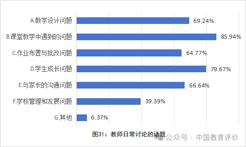 教师们平时交流讨论的话题主要集中在教育教学领域,其中讨论课堂教学中遇到的问题占85.94%,讨论教学设计问题占69.24%。此外,学生成长(79.67%)和家长沟通(66.64%)也是教师交流的重要话题,而对学校管理和发展等其他问题则关注不够,说明教师主要精力集中在自己的教学实践领域(见图31)。