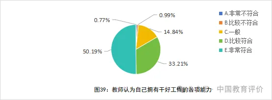 3.教师效能感。教师具有较强的专业自信心,认为自己拥有干好工作的各项能力的(“比较符合”+“非常符合”)占83.40%(见图39),这为开展教育教学工作奠定了良好心理基础。