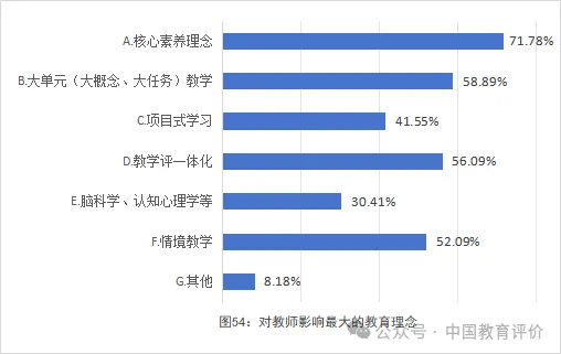 在教师的教育理念转型方面,核心素养对教师影响最大,占比71.78%。其次,“大单元教学”“情境教学”“教学评一体化”等教学实践导向的理念广泛渗透。“项目式学习”“脑科学、认知心理学”等新兴学科的影响力略显不足,仅占41.55%和30.41%(见图54)。