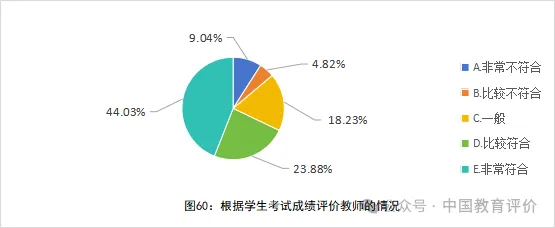 深入分析教师评价中的“唯分数论”现象发现,67.91%(“非常符合”+“比较符合”)的教师认为学校将学生考试成绩与教师绩效工资、岗位聘任等挂钩(见图60)。