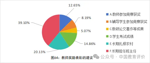 教师群体高度认可班主任岗位的价值,39.10%的教师呼吁加大对班主任的表彰奖励,肯定其付出,强化班级育人“主阵地”作用。20.13%的教师呼吁加大对长期扎根农村的教师的表彰奖励,肯定其为乡村教育发展所做出的默默奉献;14.86%的教师认为表彰奖励应适当兼顾“学生考试成绩”;12.65%和8.19%的教师肯定“教师参赛获奖”和“辅导学生参赛获奖”在评价中的价值;仅5.07%的教师认可将“教研论文著作成果”作为评价依据。(见图64)。