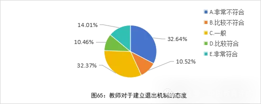 43.16%的教师明确反对建立教师退出机制(“比较不符合”+“非常不符合”)。这部分教师可能担忧这一制度会给教师职业地位带来冲击。但是也有24.47%(“比较符合”+“非常符合”)的教师认可教师退出机制对净化教师队伍、提升整体素质的作用(见图65)。