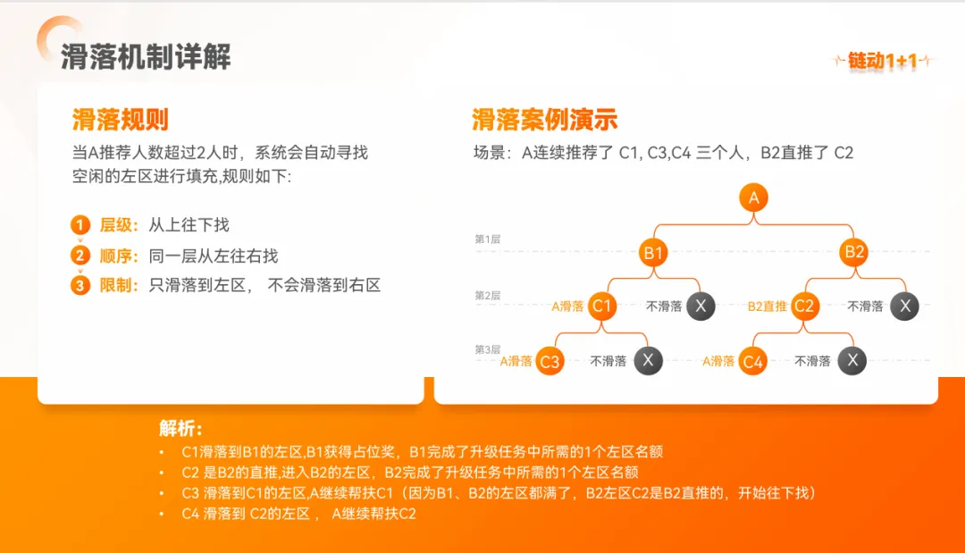 •设计逻辑:作为“滑落机制”的配套激励,鼓励用户尽早占位参与,同时补偿用户承接上级资源的“机会成本”,确保滑落机制的顺畅运行;