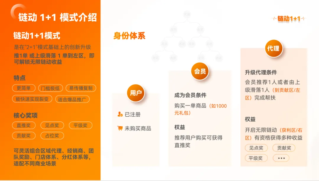 2.代理身份:升级条件具备双重路径——会员自主推荐1名用户,或通过上级滑落获得1名左区成员,满足任一条件即可自动升级。代理身份的核心价值在于解锁“无限链动收益权”,可同步享受见点奖、平级奖、贡献奖、占位奖等多重激励,实现从“单次推广收益”到“长期被动收益”的跨越。