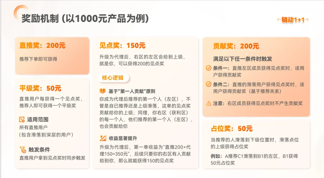 激励机制是链动1+1的核心驱动力,以1000元定价产品为基准,五大激励模块分别对应“即时转化、长期收益、帮扶动力、层级赋能、资源补位”五大场景,形成无死角的激励闭环: