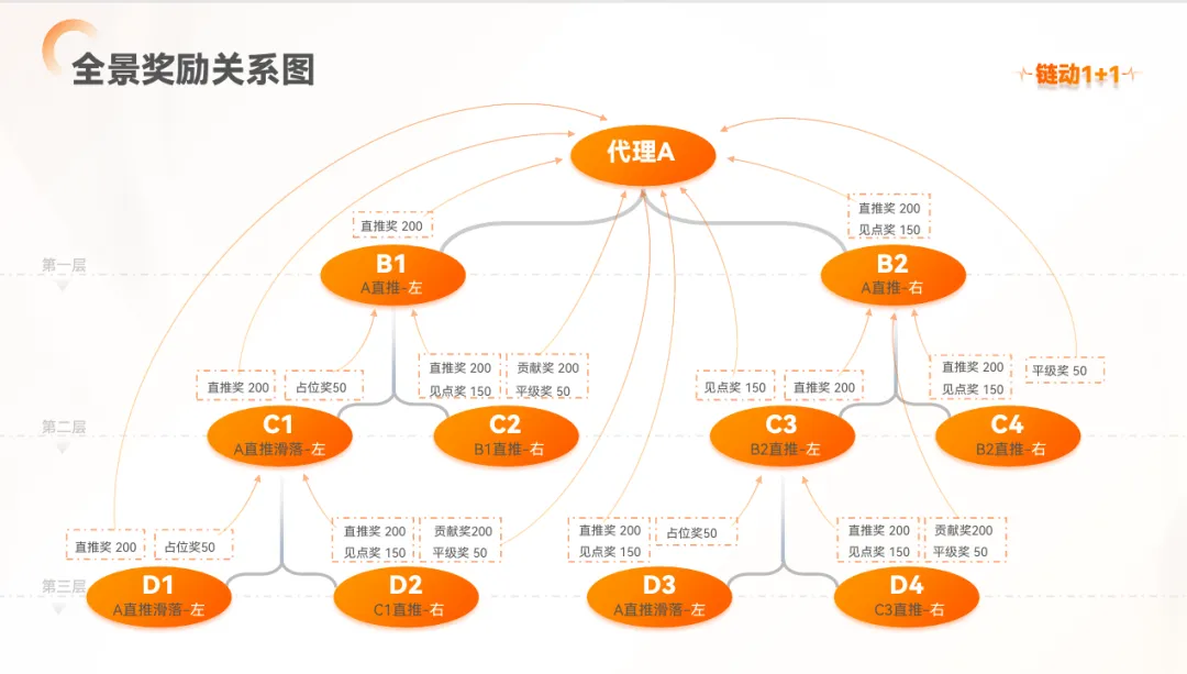 •规则特点:1:1对应见点奖,仅依赖推荐关系,与用户所在层级、区域无关,保障激励的稳定性。