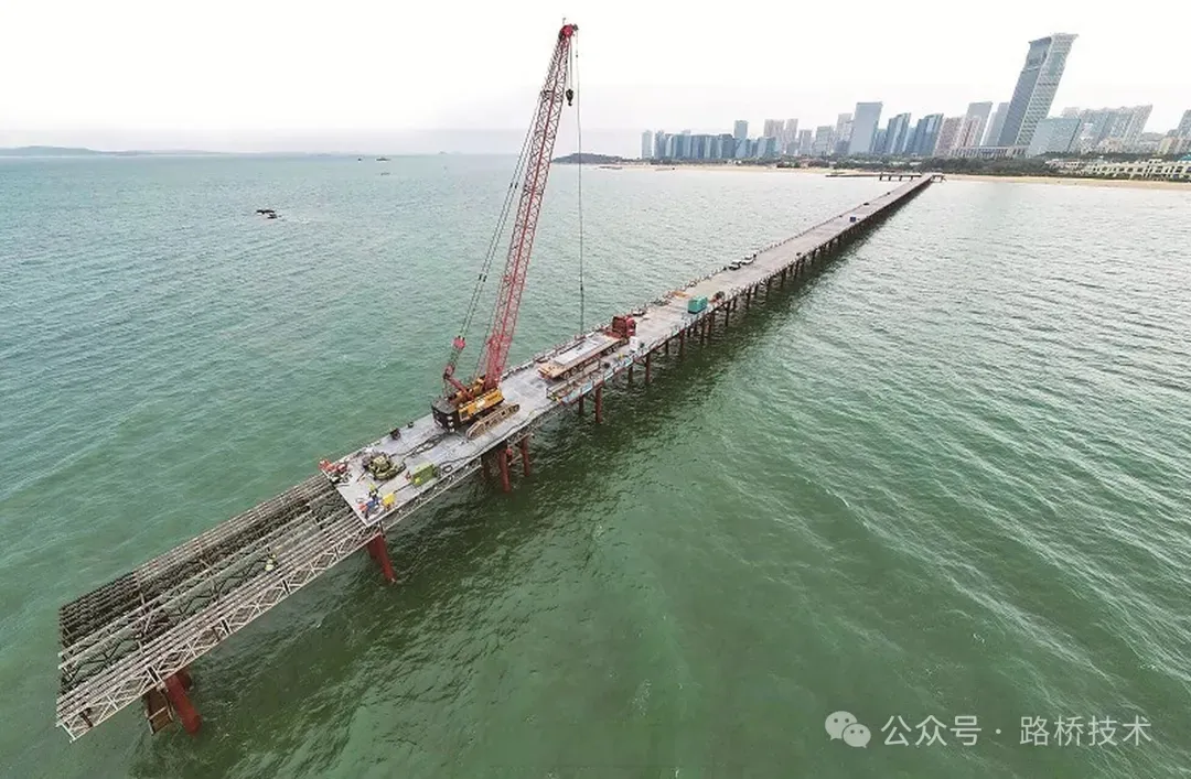 2025年1月7日,观音山互通主线桥段支栈桥及钻孔平台经厦门第三东通道工程A1标驻地监理办公室审批同意,支栈桥及钻孔平台搭设分项工程开工。根据《专项施工方案》,3#墩支栈桥施工工艺为:①首跨6根钢管桩施沉→②平联斜撑焊接→③割除多余钢管、桩头板焊接→④安装主横梁并固定→⑤安装贝雷梁、风撑、焊接限位卡→⑥安装面层及附属设施→⑦安装第二跨导向贝雷梁、第二跨3根钢管施沉;现场正开展第⑦步的“安装第二跨导向贝雷梁”,尚未开始“第二跨3根钢管施沉”的施工作业。