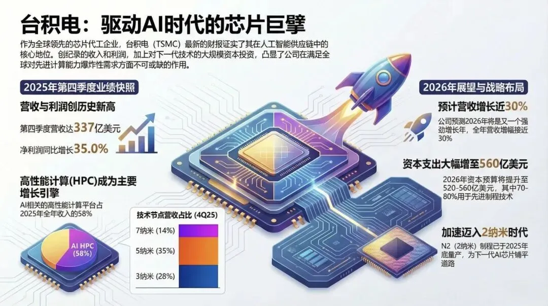之前不少人担心AI芯片会阶段性过剩,还觉得2026年一季度是消费电子淡季,台积电业绩会疲软。但台积电管理层直接把2026年资本开支上调到520-560亿美元,同比最高增幅达37%。