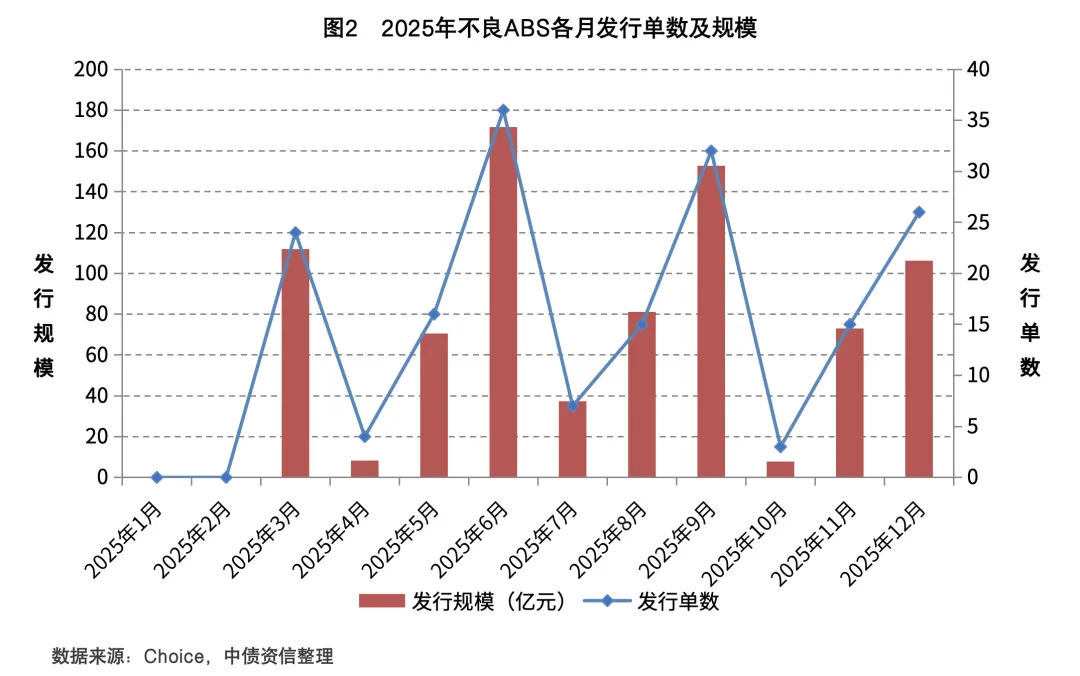 2025 年不良ABS发行178单,发行规模820.57亿元,同比分别增长36.92%和61.32%,化解不良资产约4700亿元,同比增长62.66%。发行节奏来看,呈现显著的季度末集中特征。