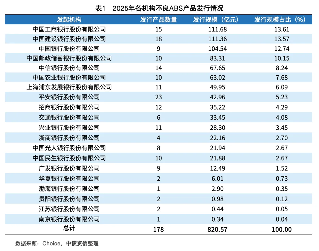 从发起机构来看,2025年不良ABS发起机构总计20家,年内新增南京银行、渤海银行2家机构。主要活跃机构为国有大行和股份制银行,发行规模占比分别为61.83%、37.96%。