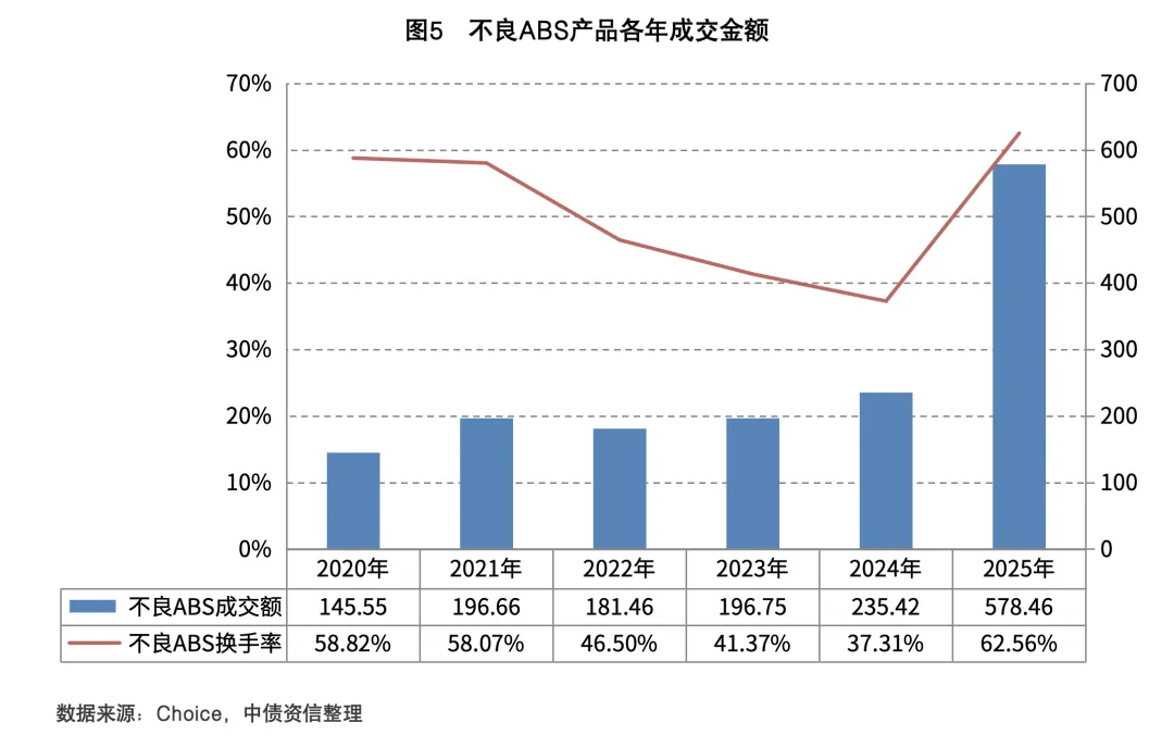 二级市场2025年成交量达578.46亿元,同比翻番;不良ABS换手率达62.56%,同比有所回暖,且持续位列信贷ABS各品种首位。