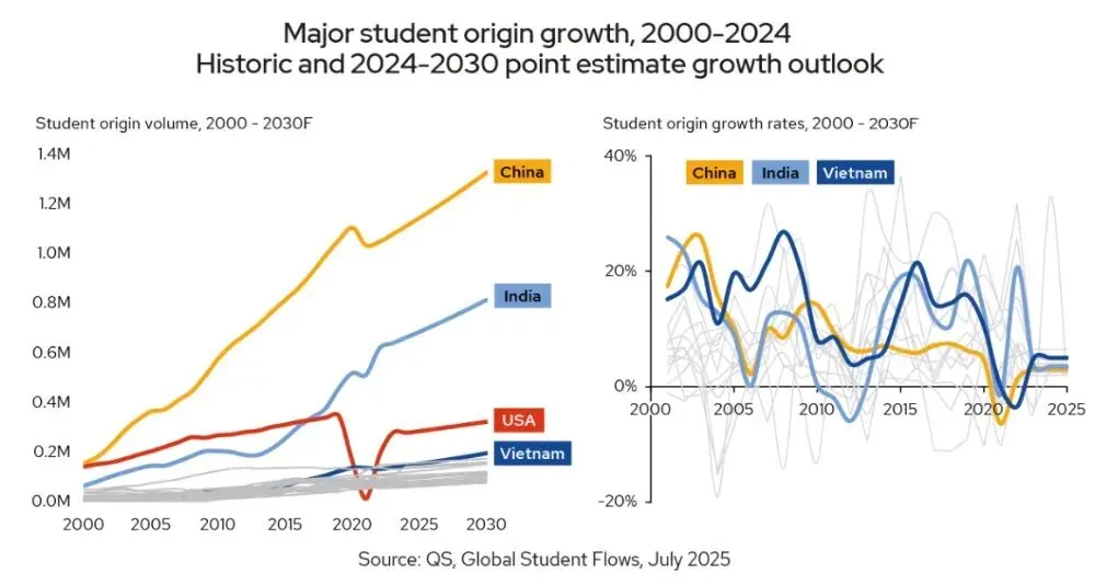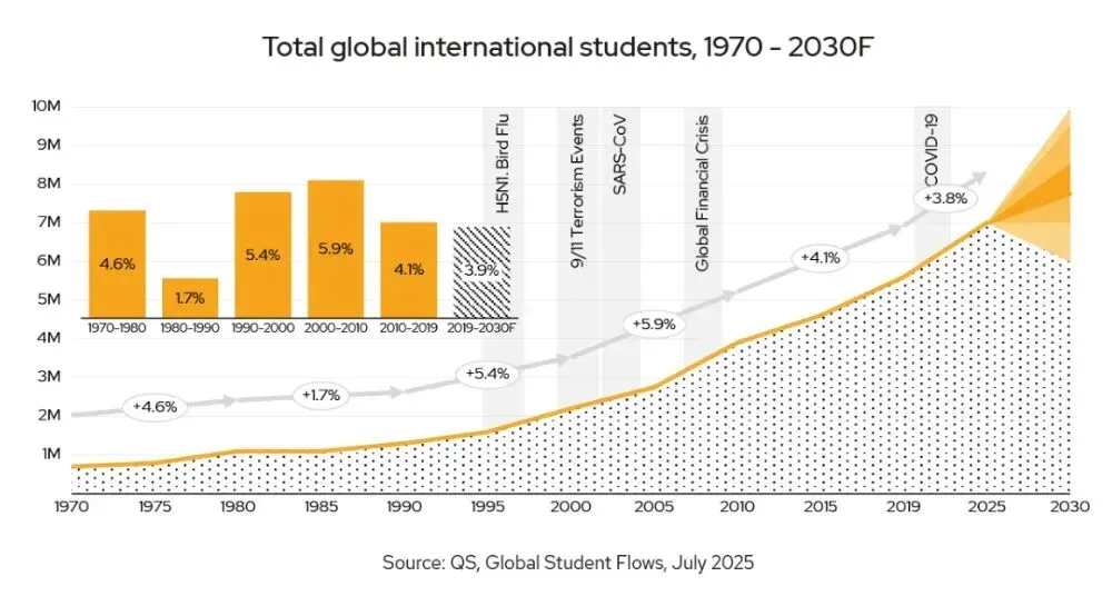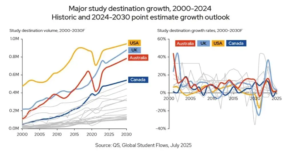 QS《QS全球学生流动报告》报告不仅预测了2030年全球跨境留学生将达到850万的规模,更揭示了这场规模空前的全球人才流动背后的深层逻辑。