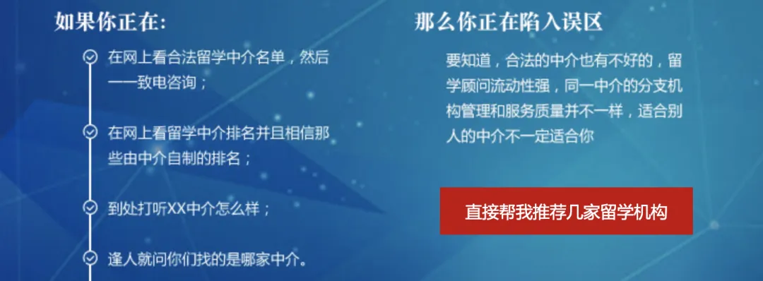 信息不对称:学生难以辨别中介资质与服务质量。教育部批准的合法中介有400余家,虽然“合法中介”一词已经成为历史,但现在特别是网络的发展,实际可做留学中介业务的机构及团队已过万家,服务中顾问流动性高,学生易被误导。