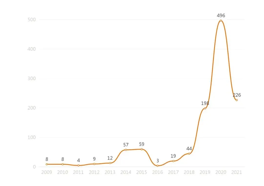 从上方的年份分布可以看到当前条件下,短视频著作权相关案例数量的变化呈上升趋势。