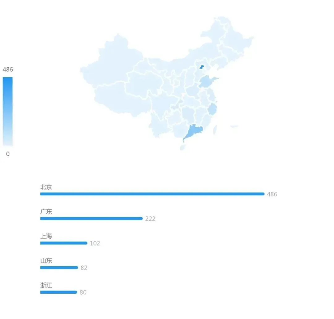 从地域分布来看,当前案例主要集中在北京市、广东省、上海市,分别占比42.04%、19.20%、8.82%。其中北京市的案件量最多,达到486件。(注:此处显示该条件下案例数量排名前五的省份。)
