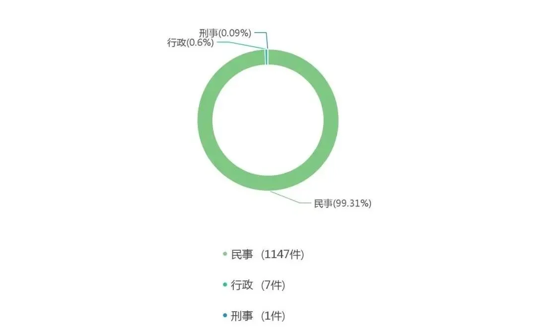 从上面的案由分类情况可以看到,当前最主要的案由是民事,有1147件,占一半以上,其次是行政,刑事。
