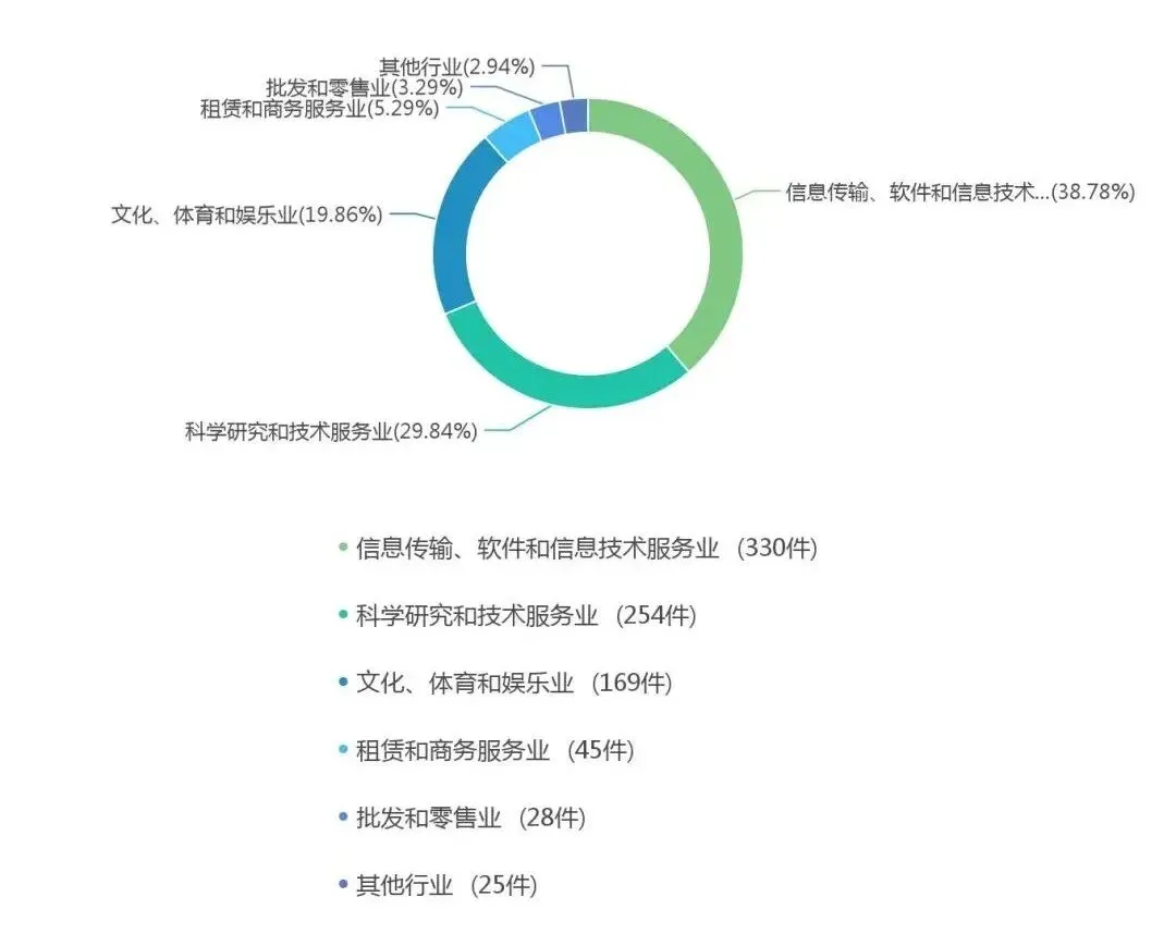 从上面的行业分类情况可以看到,当前的行业分布主要集中在信息传输、软件和信息技术服务业,科学研究和技术服务业,文化、体育和娱乐业,租赁和商务服务业,批发和零售业。