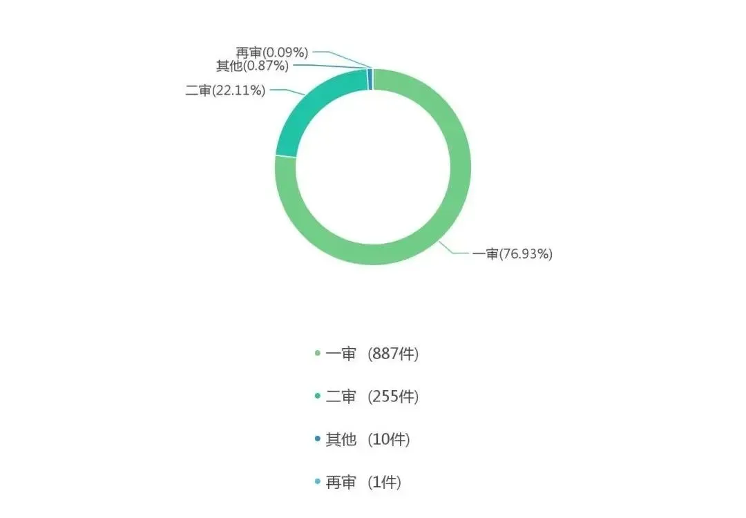 从上面的程序分类统计可以得出当前的审理程序分布状况,其中一审案件有887件,二审案件有255件,再审案件有1件。并能够推算出一审上诉率约为28.75%。