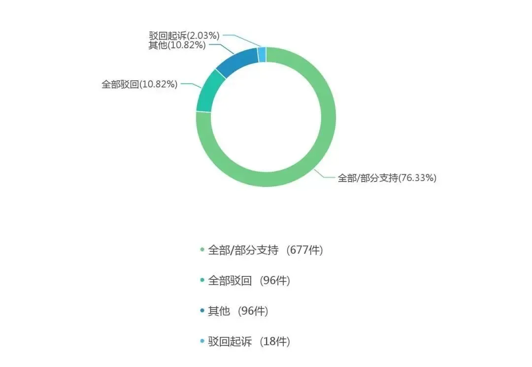 通过对一审裁判结果的可视化分析可以看到,当前条件下全部/部分支持的有677件,占比为76.32%;全部驳回的有96件,占比为10.82%;其他的有96件,占比为10.82%。