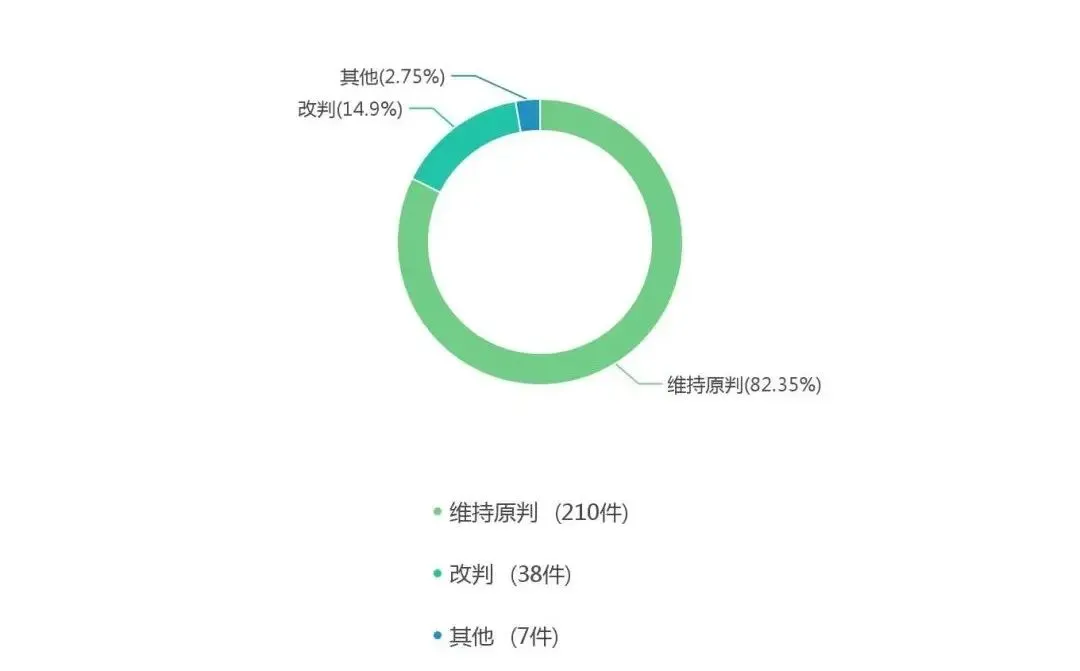 通过对二审裁判结果的可视化分析可以看到,当前条件下维持原判的有210件,占比为82.35%;改判的有38件,占比为14.90%;其他的有7件,占比为2.75%。