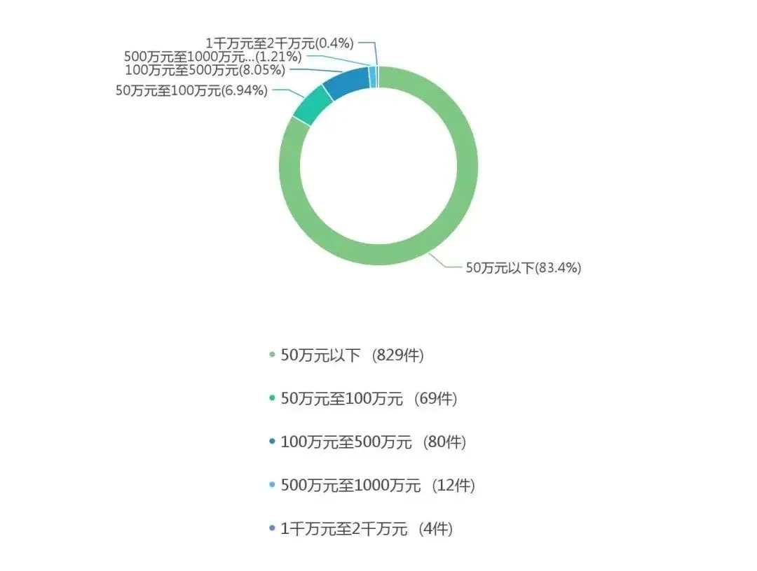 通过对标的额的可视化分析可以看到,标的额为50万元以下的案件数量最多,有829件,100万元至500万元的案件有80件,50万元至100万元的案件有69件,500万元至1000万元的案件有12件,1千万元至2千万元的案件有4件。