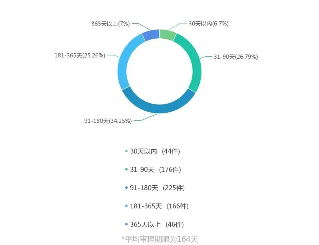 通过对审理期限的可视化分析可以看到,当前条件下的审理时间更多处在91-180天的区间内,平均时间为164天。