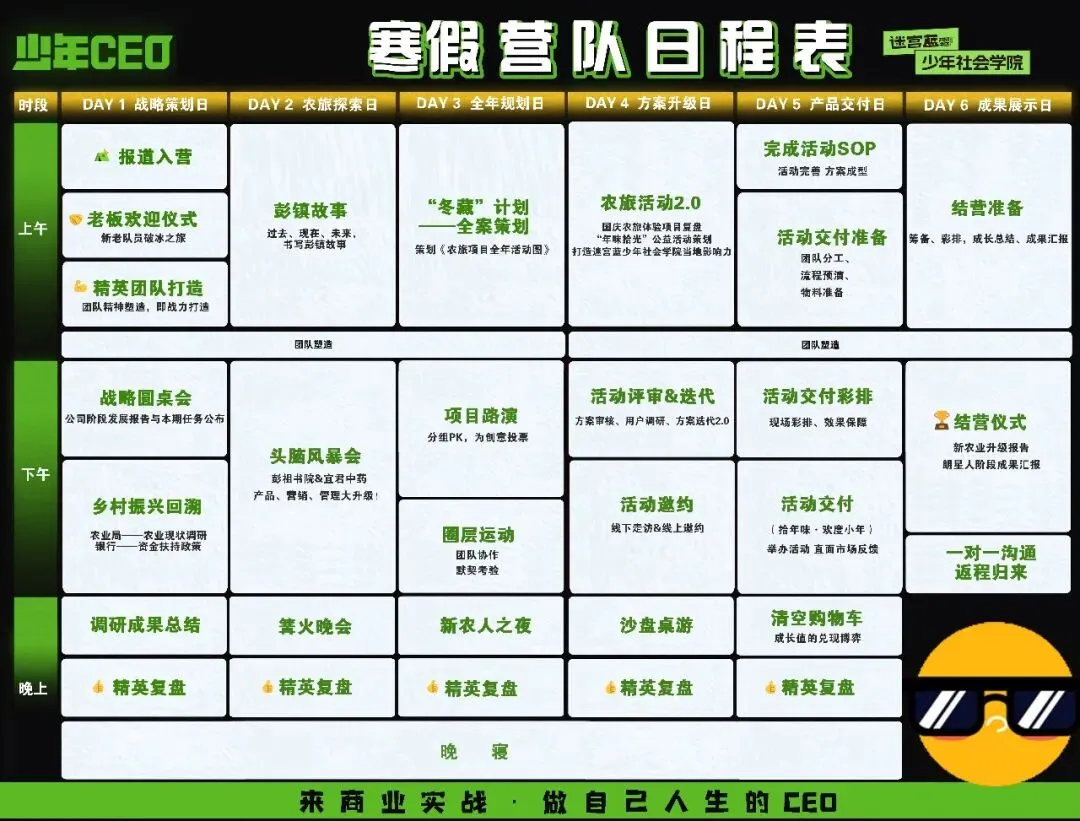 我们把6天行程拆解为战略策划、农旅探索、全年规划、方案升级、产品交付、成果展示六大核心阶段,每天都有明确的实战目标: