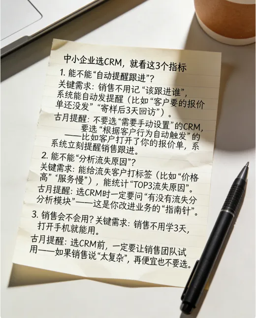 古月提醒:不要选“需要手动设置”的CRM,要选“根据客户行为自动触发”的——比如客户打开了你的报价单,系统立刻提醒销售跟进。