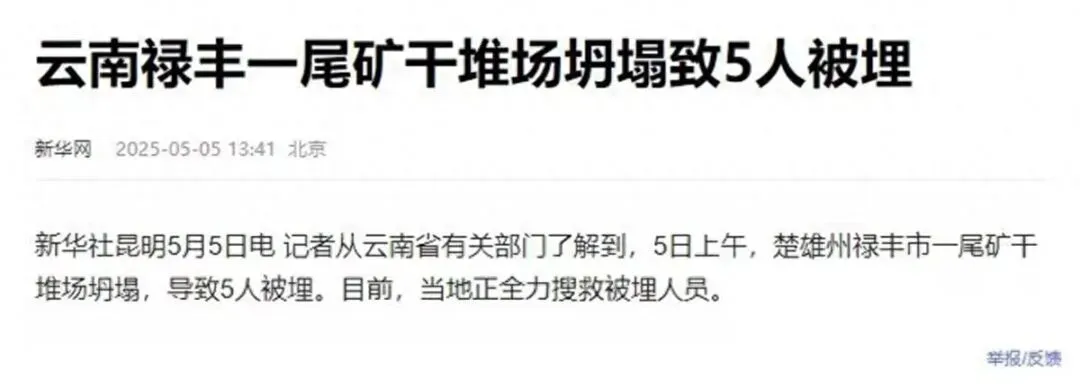 据 新华社 2025年5月5日消息,当日上午,云南禄丰一尾矿干堆场坍塌致5人被埋。