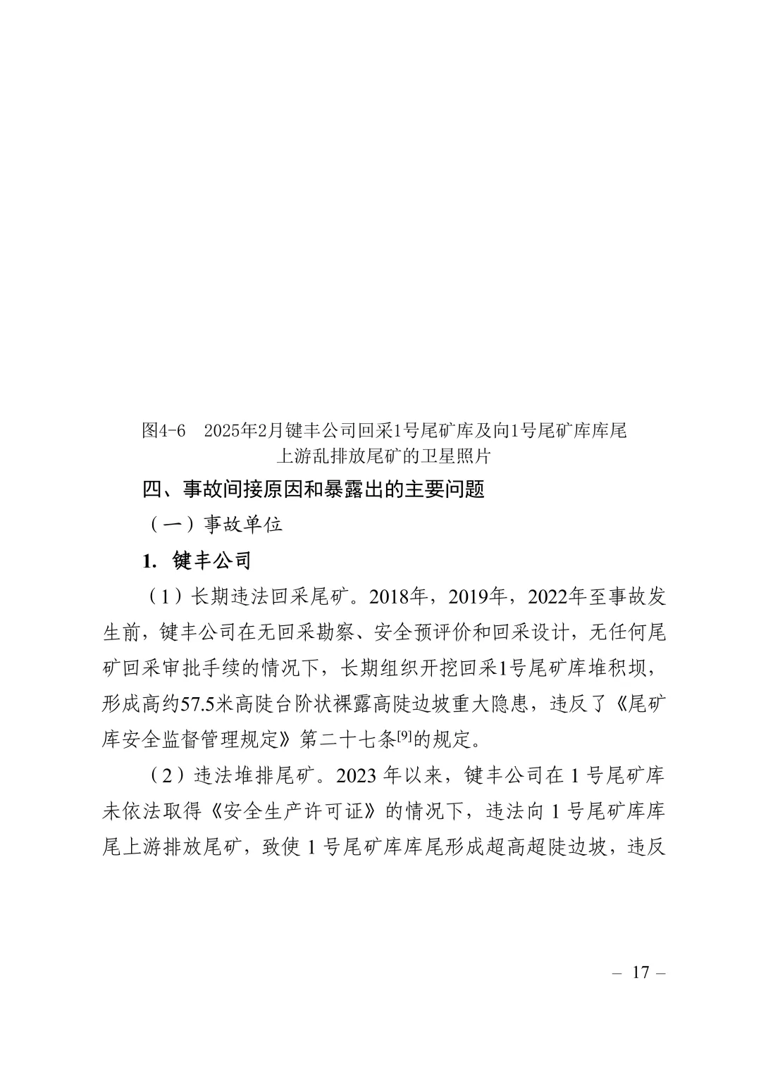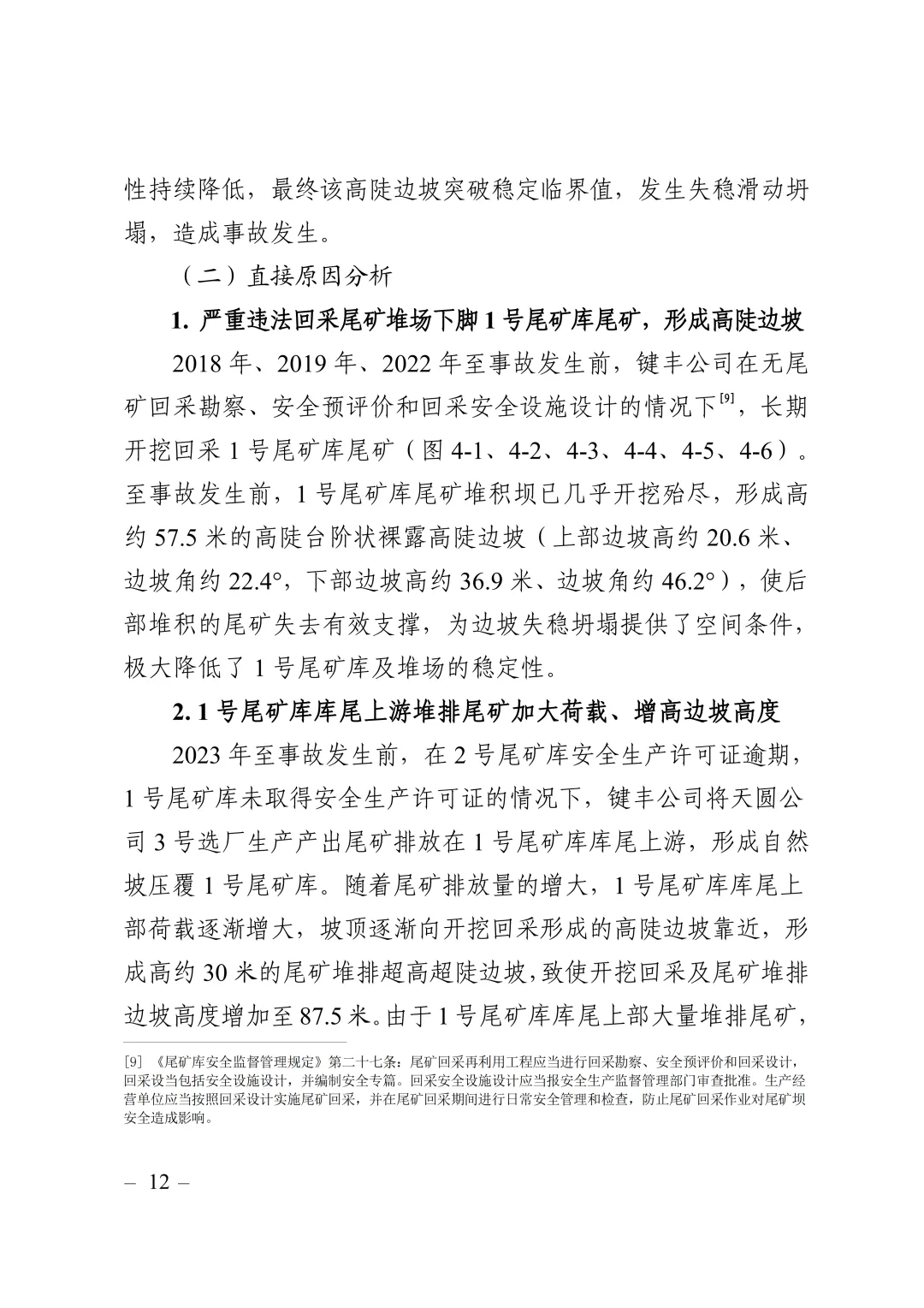 键丰公司长期违法开挖回采1号尾矿库,使尾矿堆积外边坡高度不断增加变陡,导致1号尾矿库在堆场坡脚形成高陡边坡(尾矿堆场坡脚形成高陡临空面),同时,键丰公司向1号尾矿库库尾上游随意违规堆排大量高含水率流塑态软土的尾矿,增大尾矿土质边坡高度,也增加了尾矿库上部荷载,导致尾矿土质边坡稳定性持续降低,最终该高陡边坡突破稳定临界值,发生失稳滑动坍塌,造成事故发生。