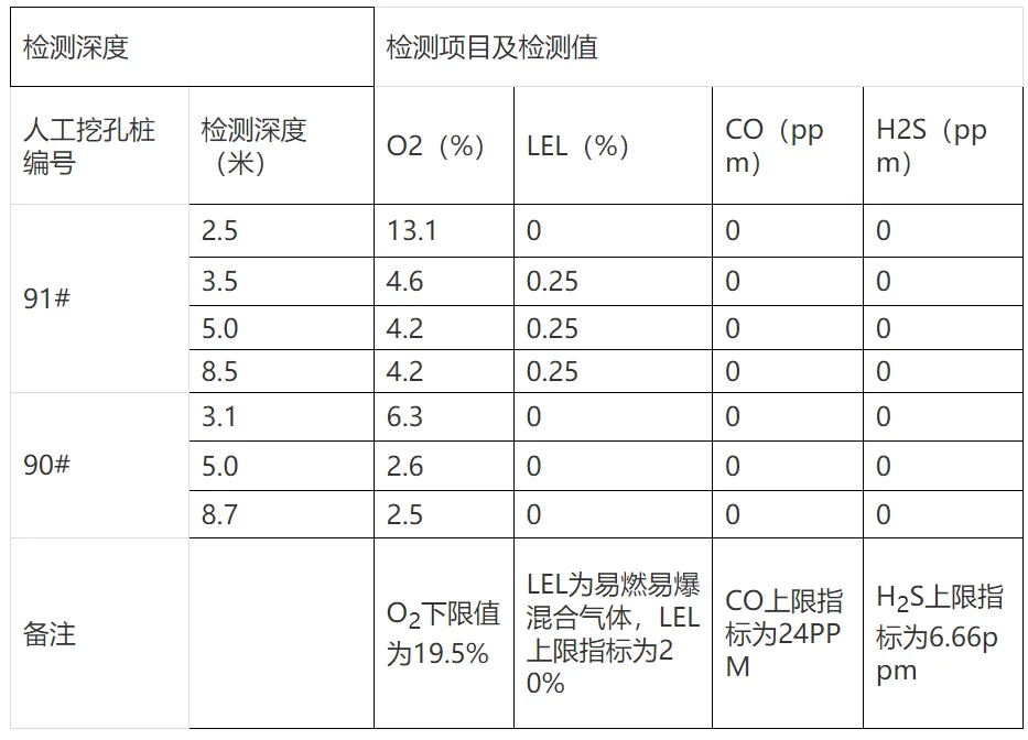 2018年5月23日上午,调查组聘请四川泸天化股份有限公司专业人员对91号人工挖孔桩及邻近的90号人工挖孔桩桩内的有关气体进行检测,检测当日天气为:阴天,检测结果如下:
