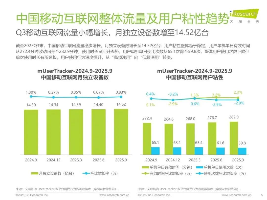 报告基于艾瑞UserTracker多平台行为监测,覆盖2024.9-2025.9中国移动互联网14.52亿台月活设备、智能大屏3.44亿台终端,从规模、粘性、结构、行业、价值榜五大维度,刻画“流量微增、时长回升、AI驱动、下沉深化”的季度特征,并给出“存量深耕+技术嵌入”的核心结论。
