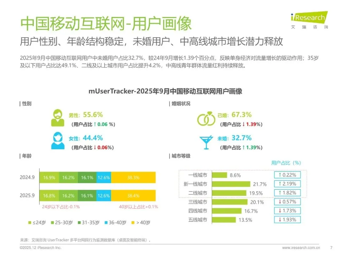 3. 结构:未婚用户升至32.7%(+1.39pct),35岁及以下占49.1%,二线及以上城市占比提升4.2pct,中高线青年红利持续释放。