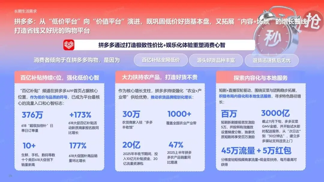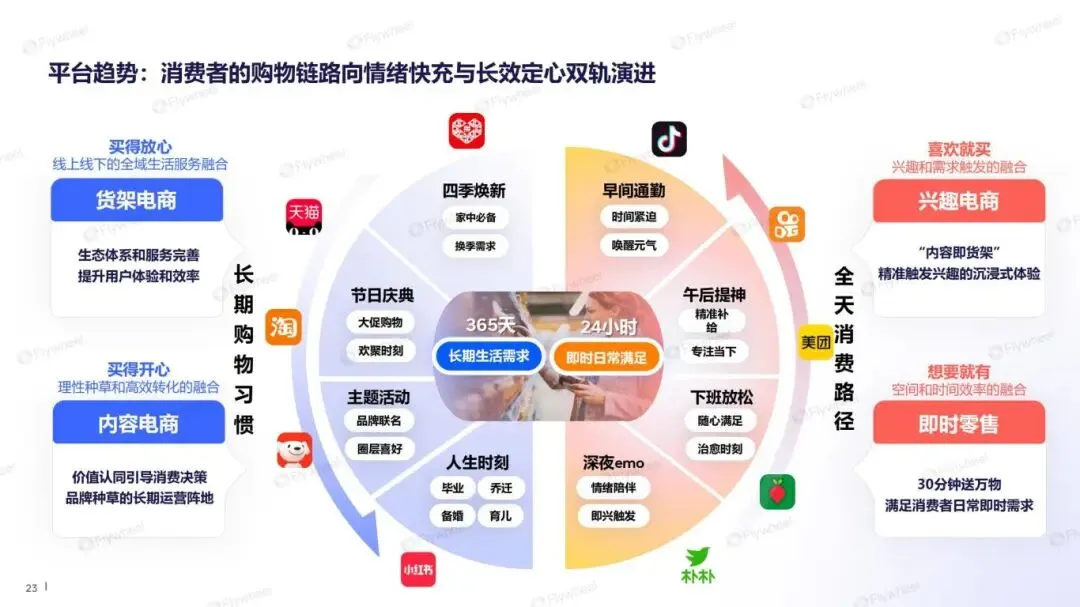 主流电商平台在“情绪快充”与“长效定心”双轨消费趋势下展开战略布局。淘天、京东、拼多多等“储备型平台”强化货品、服务与会员体系的长期价值;抖音、小红书等内容平台以兴趣种草与情绪共鸣驱动即时转化;美团闪购等即时零售平台则聚焦场景触发与30分钟送达的“情绪兑现”。平台正在从“运营渠道”向“经营用户情绪与长期关系”演进。