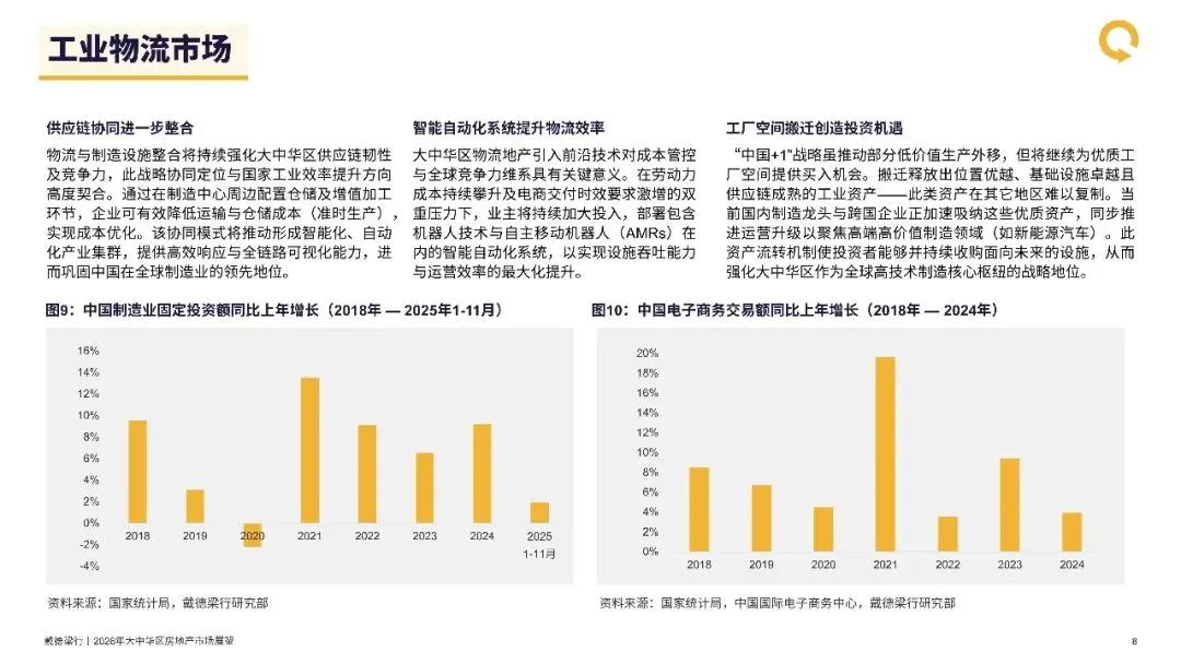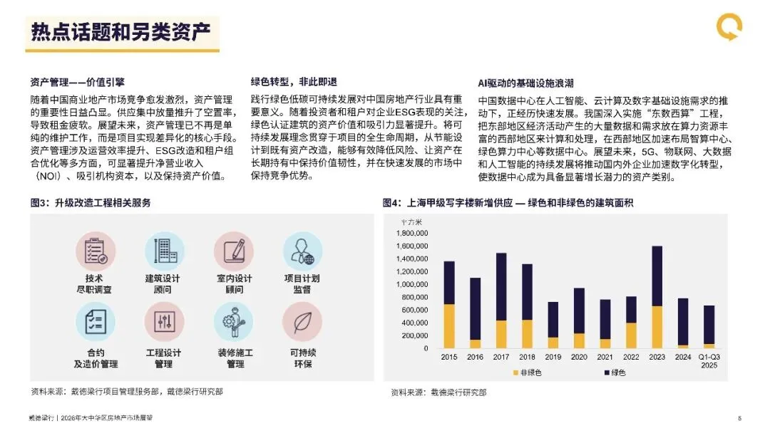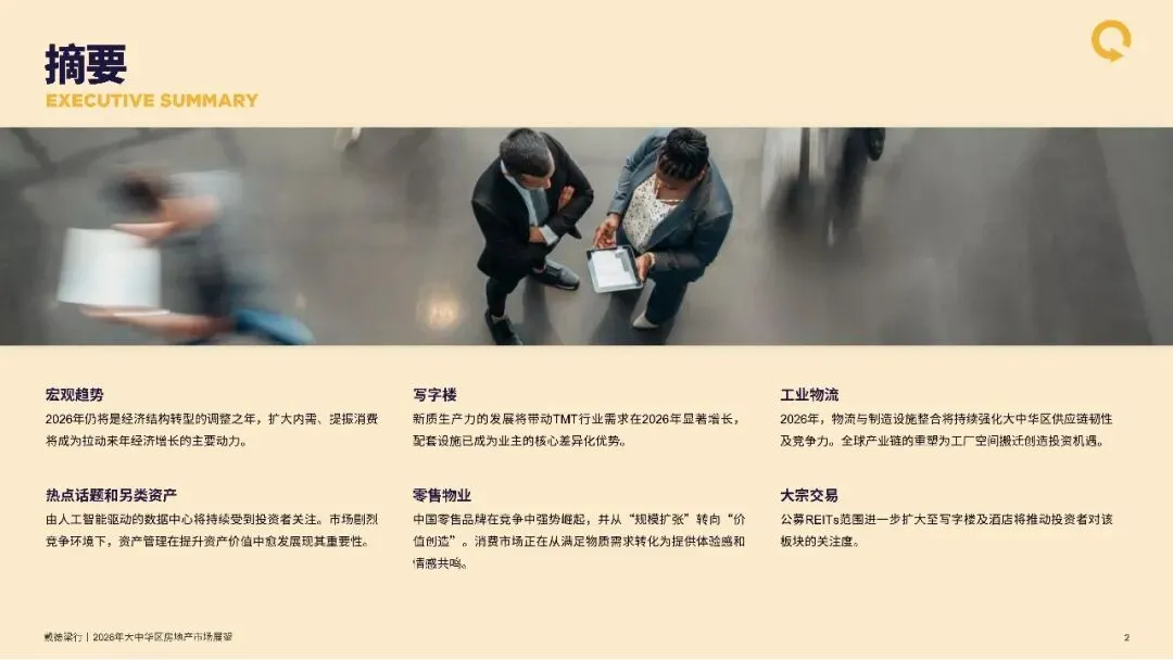 作为 “十五五 ”规划的开局之年 ,2026年大中华区商业地产的发展受到包括宏观经济 、产业布局 、市场供给与消费迭代等多重因素的影响 。本篇报告考察了近些年房地产市场的发展情况 ,并探讨了 2026年可能影响未来市场发展机遇的相关领域 。