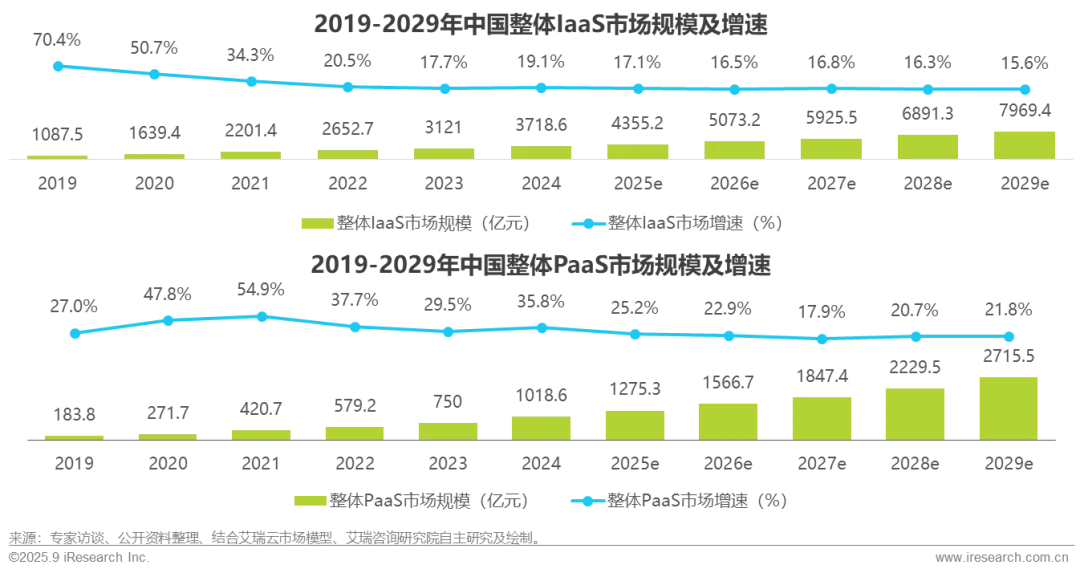 市场概览:2024年中国整体IaaS市场增速为3718.6亿元,增速为19.1%;整体PaaS市场规模为1018.6亿元,增速为35.8%。