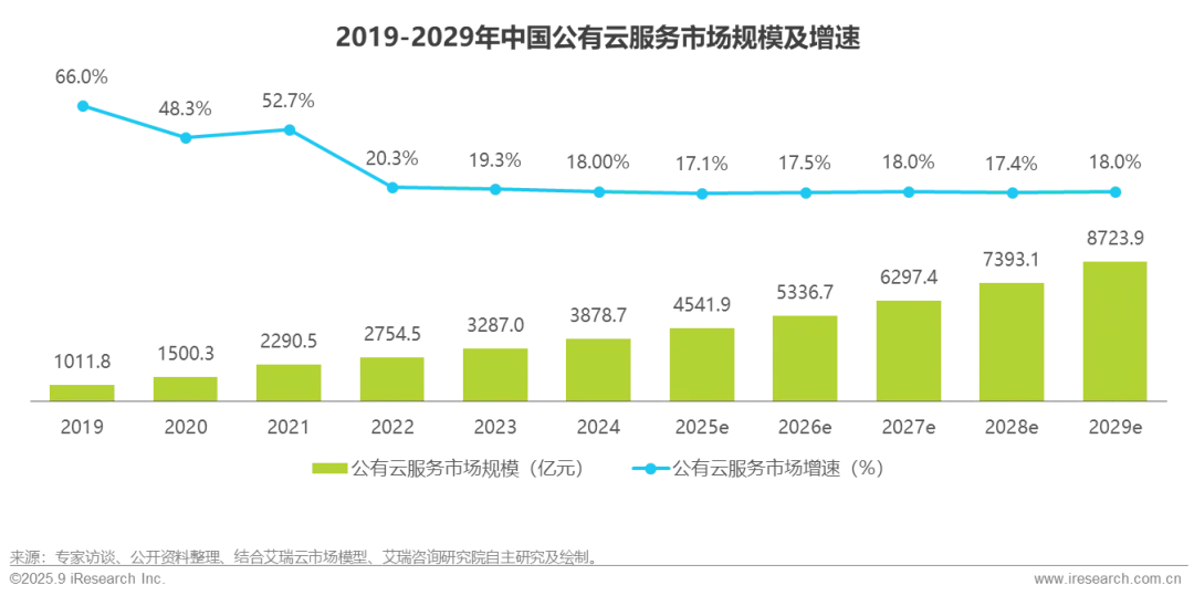 市场概览:2024年中国公有云服务市场规模为3878.7亿元,增速为18%。
