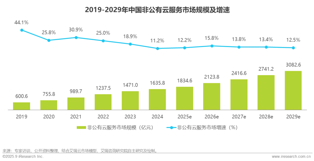 市场概览:2024年中国非公有云服务市场规模为1635.8亿元,增速为11.2%。