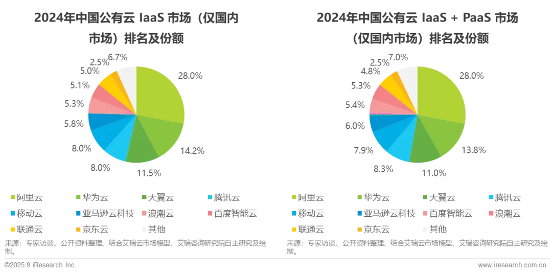 公有云IaaS市场中,阿里云、华为云、天翼云排名前三,腾讯云与移动云并列第四,亚马逊云科技位列第五。