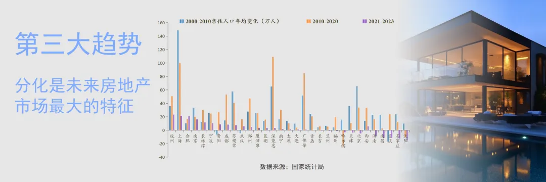 迈向后房地产时代,促进市场止跌回稳,调整和分化是未来主要趋势,人口向都市圈城市群集聚。