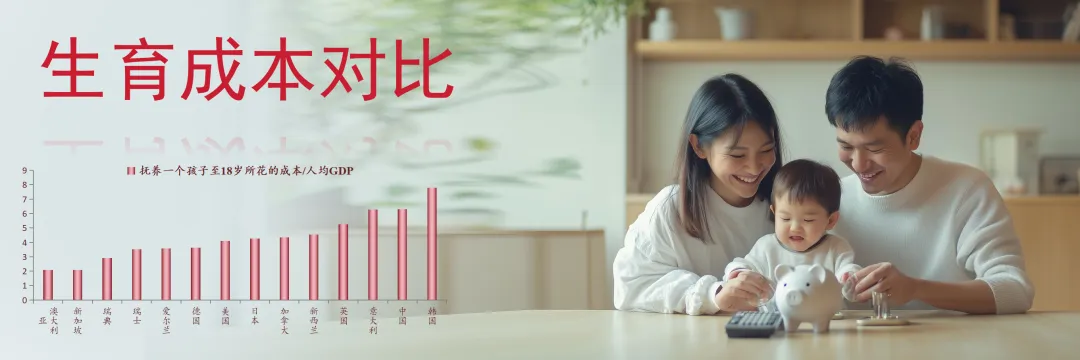 把一个孩子抚养到刚年满18岁所花的成本相对于人均GDP的倍数,澳大利亚是2.1倍,法国是2.2倍,瑞典是2.9倍,德国是3.6倍,美国是4.1倍,日本是4.3倍,
