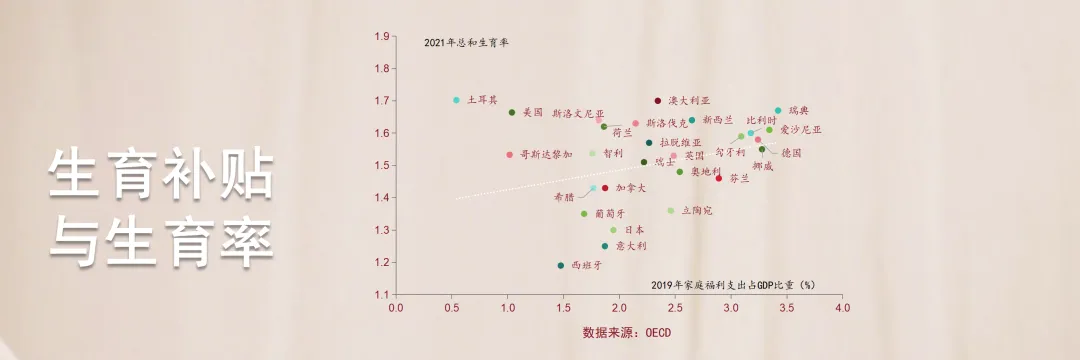 比如根据OECD数据,北欧国家家庭福利支出占比2%以上,普遍高于南欧和东亚国家,生育率也相对较高,2021年生育率北欧1.58、南欧1.33、东亚1.17。