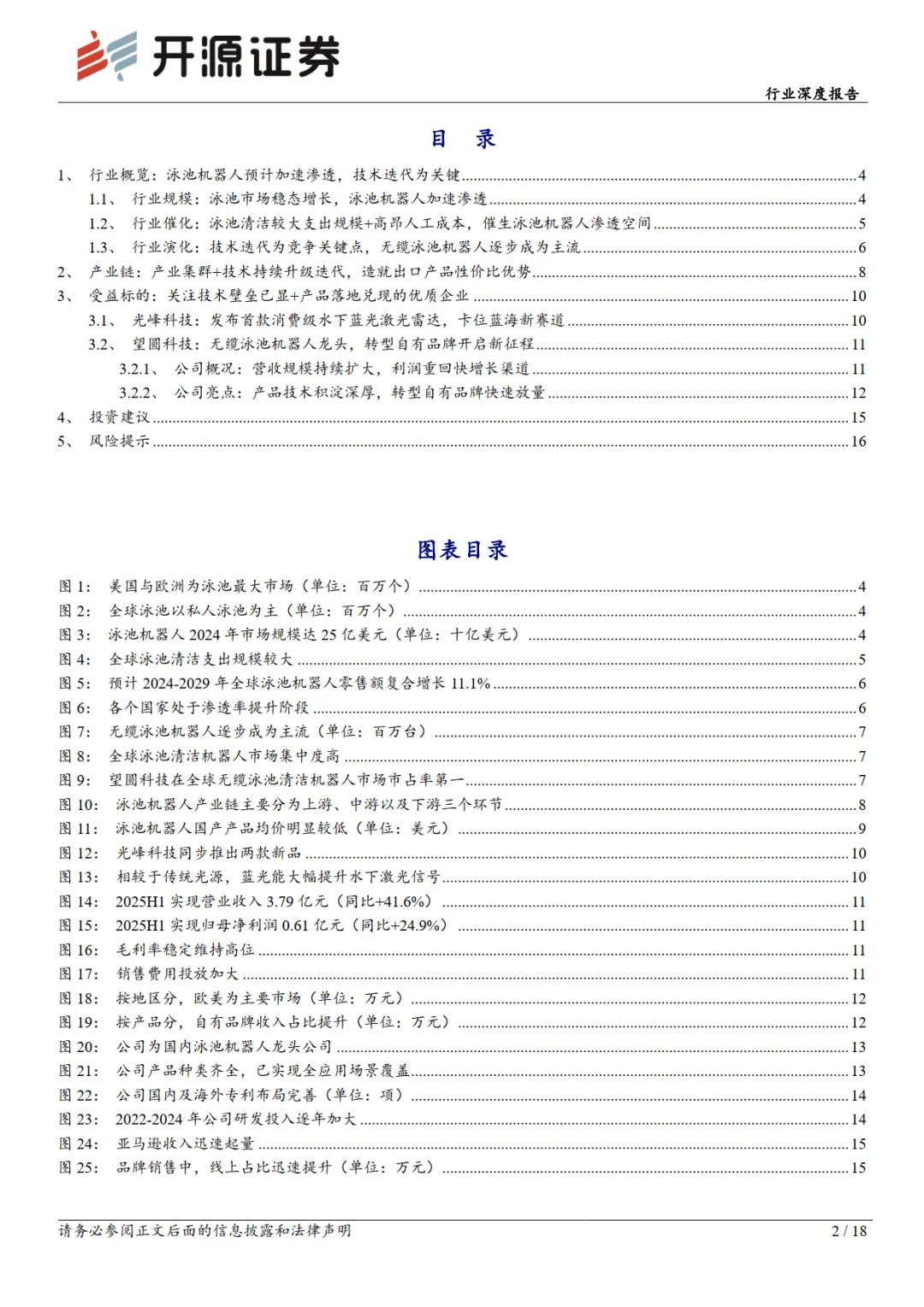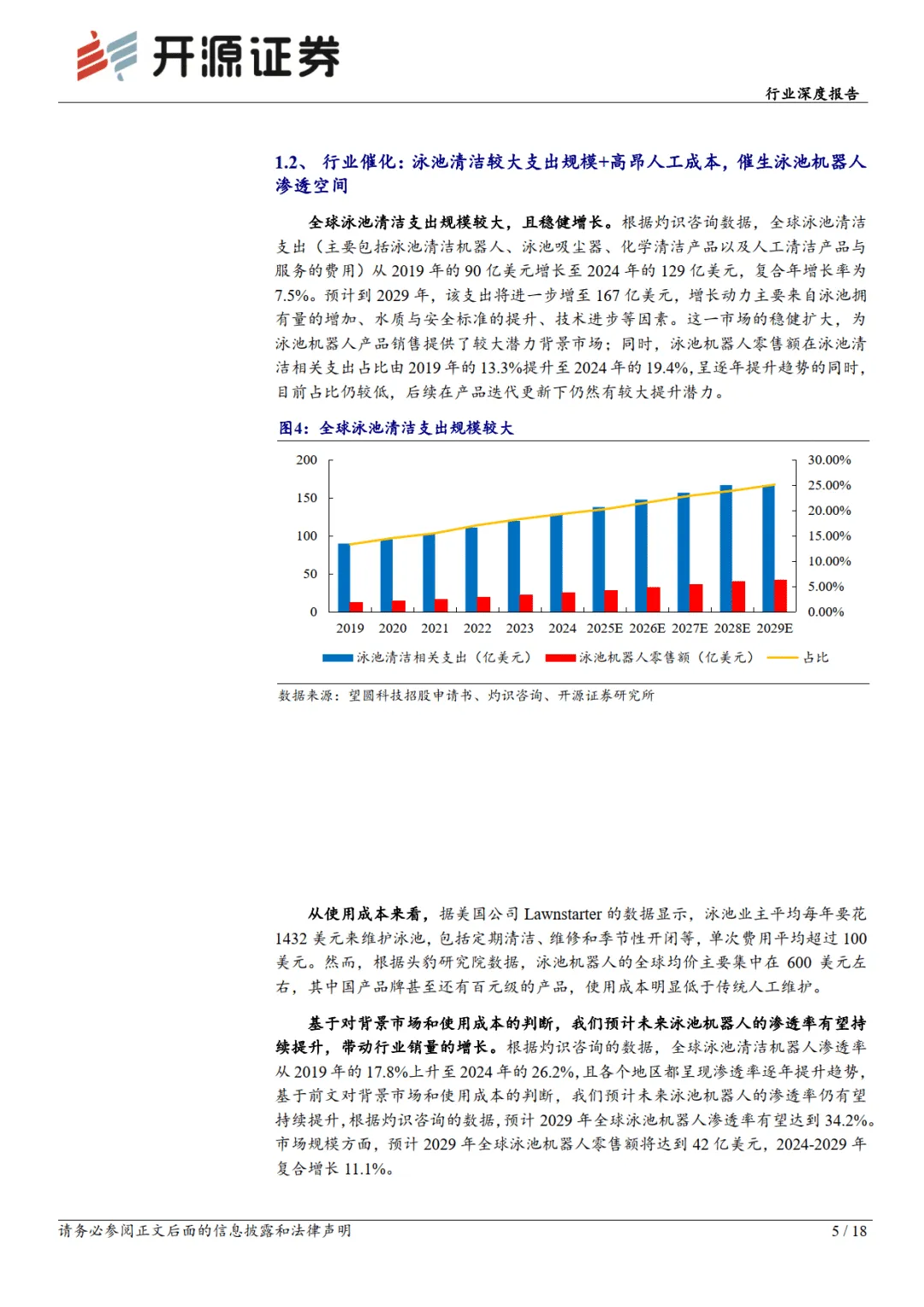 全球泳池市场稳步增长,2024 年总数约 3290 万个,预计 2024-2029 年年复合增长率 3.6%,2029 年将达 3930 万个,欧美为主要市场,2024 年合计占比 62.6%,且私人泳池占比高达 97.6%。泳池机器人市场呈现加速渗透态势,2024 年市场规模达 25 亿美元,2019-2024 年复合增长率 15.7%。全球泳池清洁支出规模大且稳健增长,2019-2024 年复合增长率 7.5%,2024 年达 129 亿美元,而泳池机器人使用成本显著低于传统人工维护,推动渗透率持续提升,2024 年渗透率 26.2%,预计 2029 年将达 34.2%,零售额有望达 42 亿美元,2024-2029 年复合增长 11.1%。————