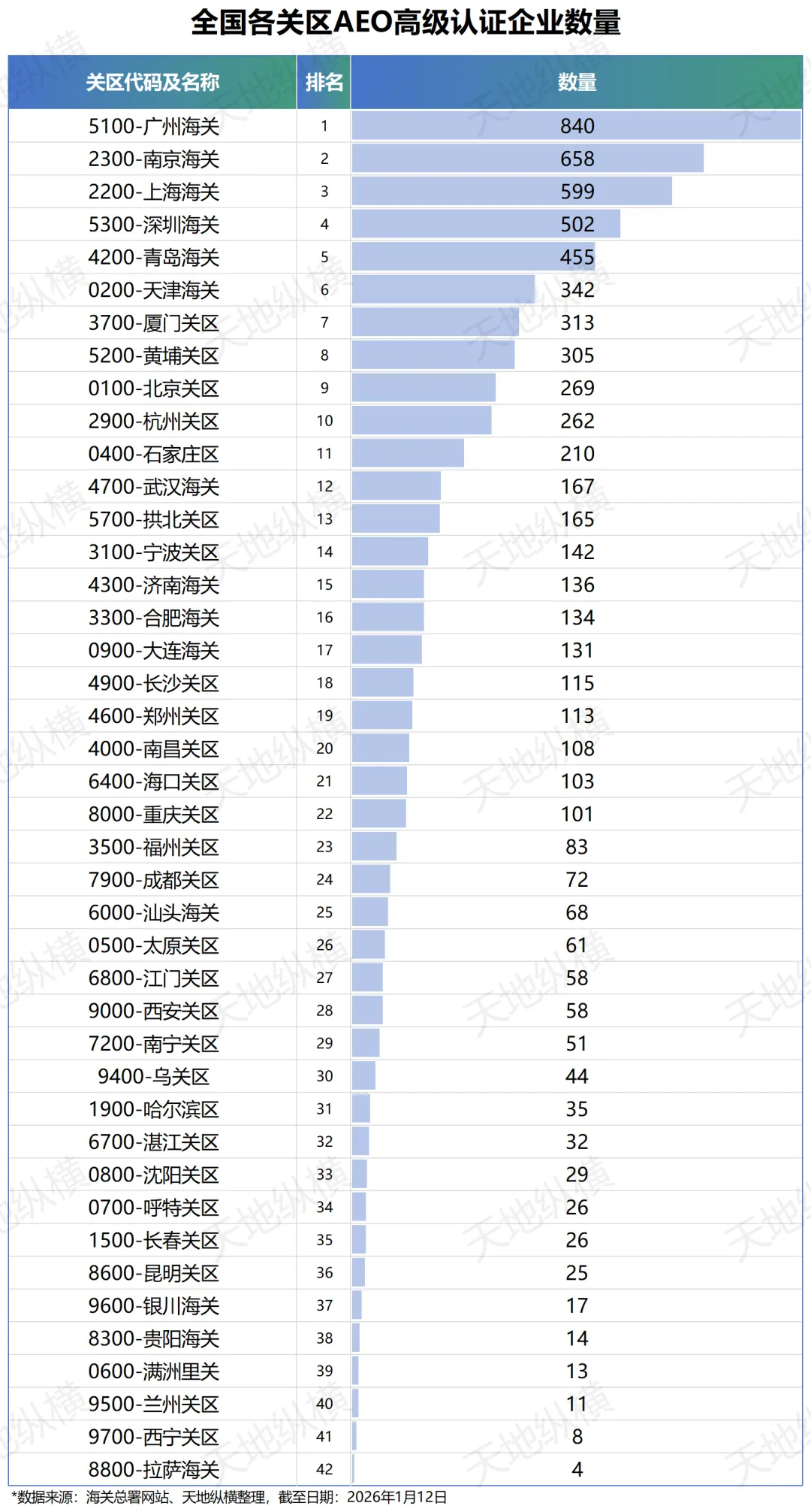 关区排名与省级排名高度契合,核心口岸领跑。广州海关以840家位居关区第一,南京海关、上海海关、深圳海关、青岛海关紧随其后,前五大关区的AEO企业数量均超过300家;而这些关区恰好对应广东、江苏、上海、山东等外贸大省的核心口岸,覆盖了我国最活跃的外贸产业带。此外,天津海关、厦门关区、杭州关区等也位居前列,形成了“核心口岸引领、区域口岸协同”的格局。