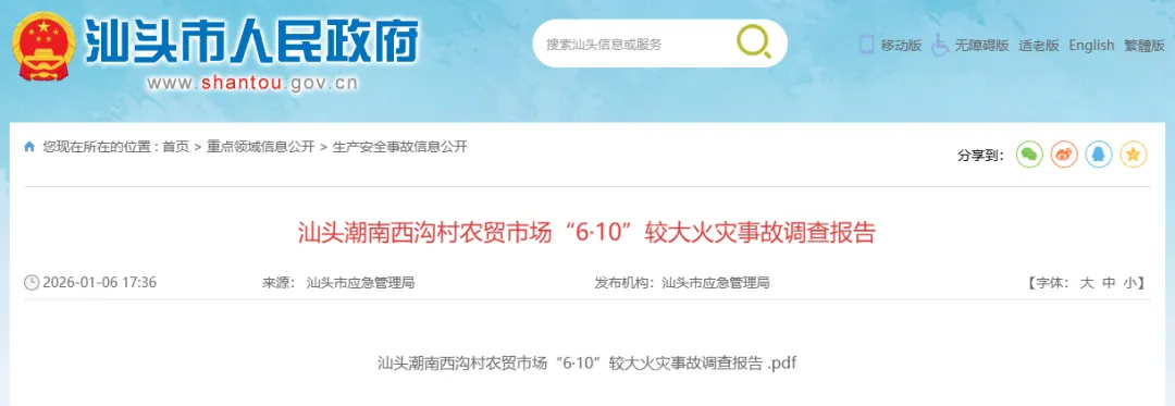 据新华社消息,广东省汕头市人民政府门户网站1月6日公布“汕头潮南西沟村农贸市场‘6·10’较大火灾事故调查报告”。报告显示,2025年6月10日1时许,汕头市潮南区峡山街道西沟村农贸市场发生火灾,造成3人死亡,过火面积及受损建筑面积2500平方米。事故发生后,汕头市有关部门单位组成汕头潮南西沟市场“6·10”较大火灾事故调查组,汕头市纪委监委成立调查组,提前介入事故追责问责审查调查工作。